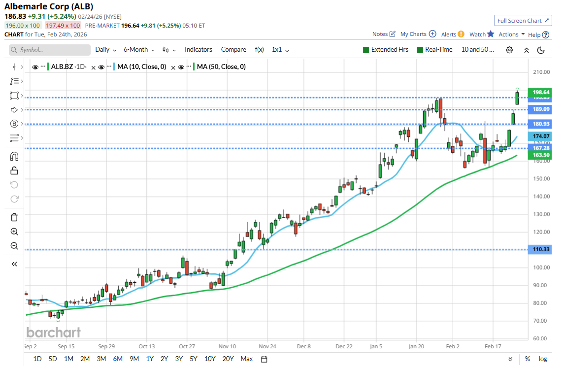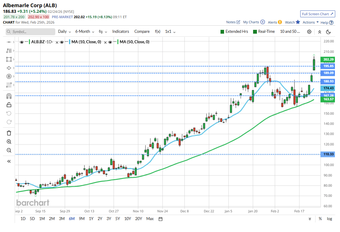 10 hours, 25 minutes agoAlbemarle Corp ALB US added +5.24% on the regular session yesterday and are up by another +5.23% in the US pre market this morning.