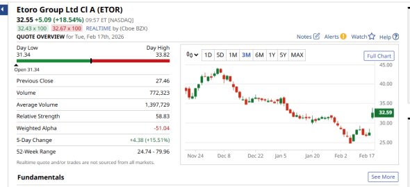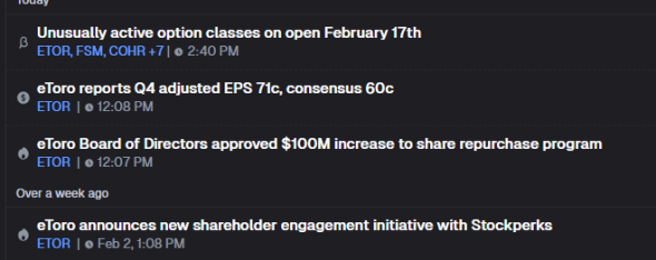 5 hours, 37 minutes agoMulti asset broker eToro ETOR US sees its stock rally by +18.0% today following better than expected earnings and news of an additional $100 million share buy back.