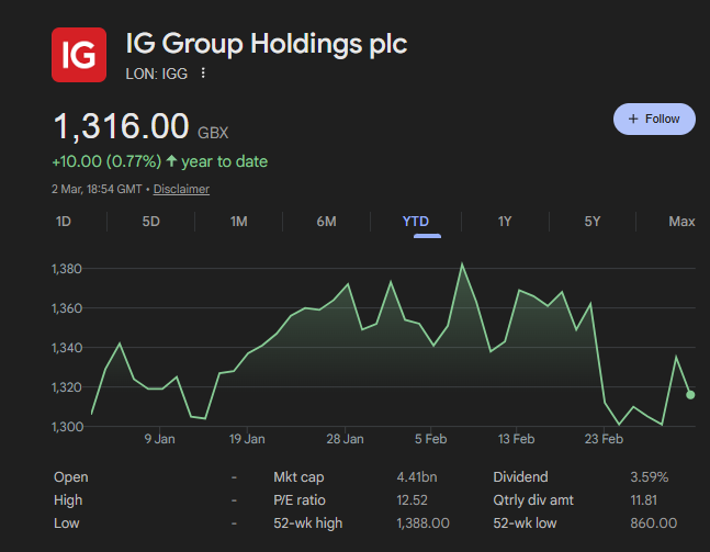 “Upgrade to Buy We upgrade IG from Neutral to Buy, and raise our price target from 1250p to 1600p. IG should benefit from market volatility and trading activity, but is also self-helping with