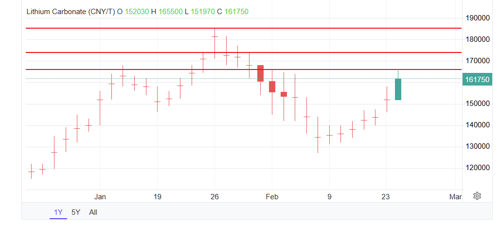 1 day, 6 hours agoCan’t help but notice that Albemarle ALB US have sprung back to life in the last 24 hours as Lithium prices rally by +5.74% . Both the stock and the commodity are well below recent highs, but the signs of life are encouraging and I am inclined to watch them closely from here.