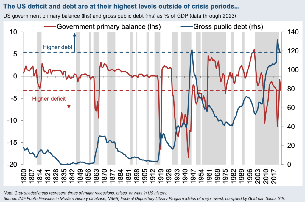 Goldman Sachs, the US investment bank, estimates that the US deficit and debt are at their highest levels in decades (see below). Should the global economy slip into a recession, tax revenue will contract and the US debt-to-GDP may spike to stratospheric levels.
