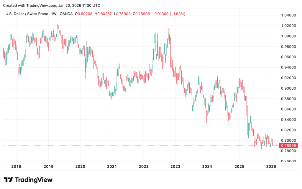 The FX pair that is showing the weakest USD is USD-CHF. The rate is on a multi-year decline. Prices, as you can see below, have not even recovered from the damage inflicted by last year’s tariff shock.