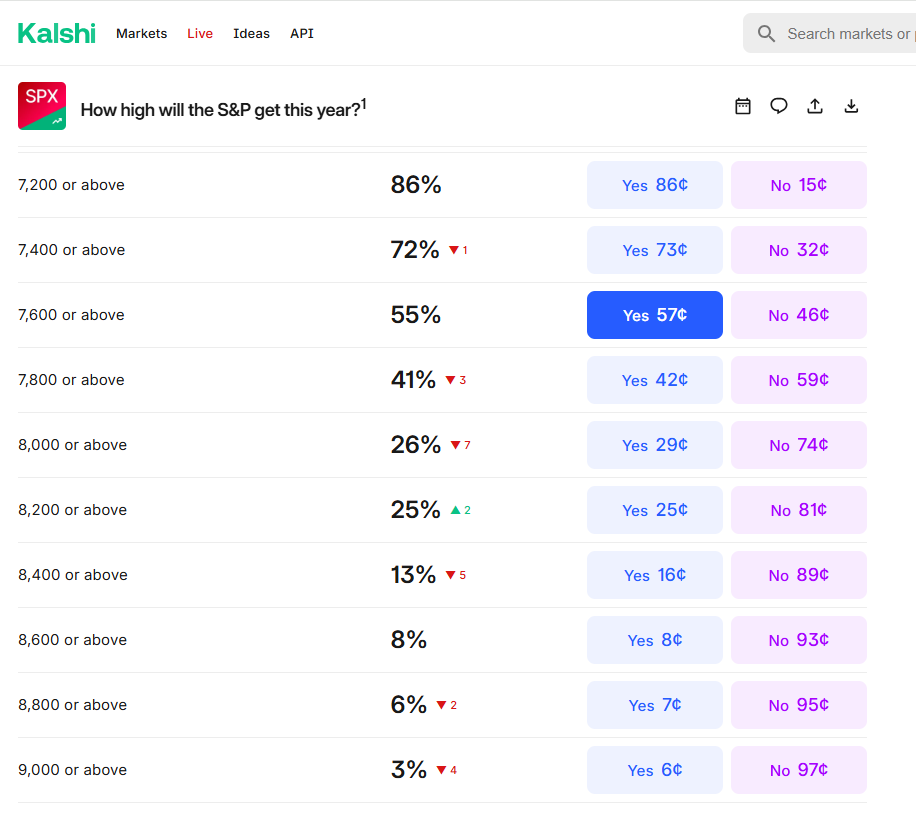 I’ve recently become a little bit obsessed with prediction markets. Yes I know they are just the US equivalent of binary options. But the US have been quick to regulate them as opposed to the FCA, which refused to touch them, meaning the industry was flooded with crooks. But anyway, there has got to be a good arb here somewhere. Any thoughts on how high the S&P 500 could get in 2026? Kalshi is currently predicting only a 3% chance of it breaking through 9,000…