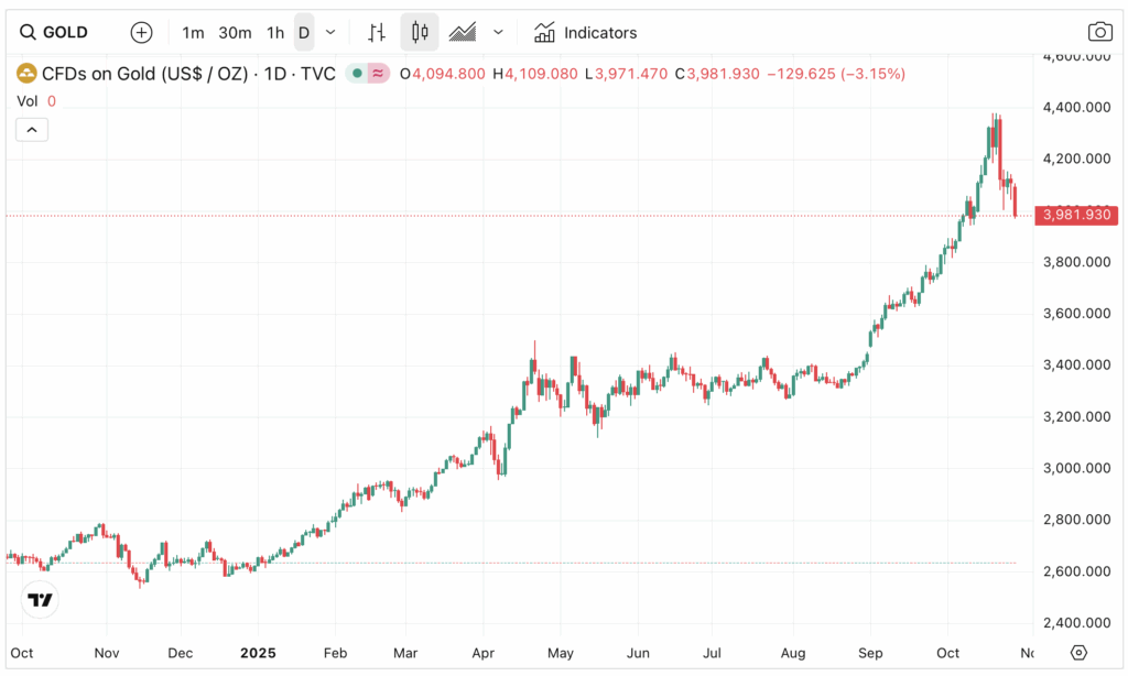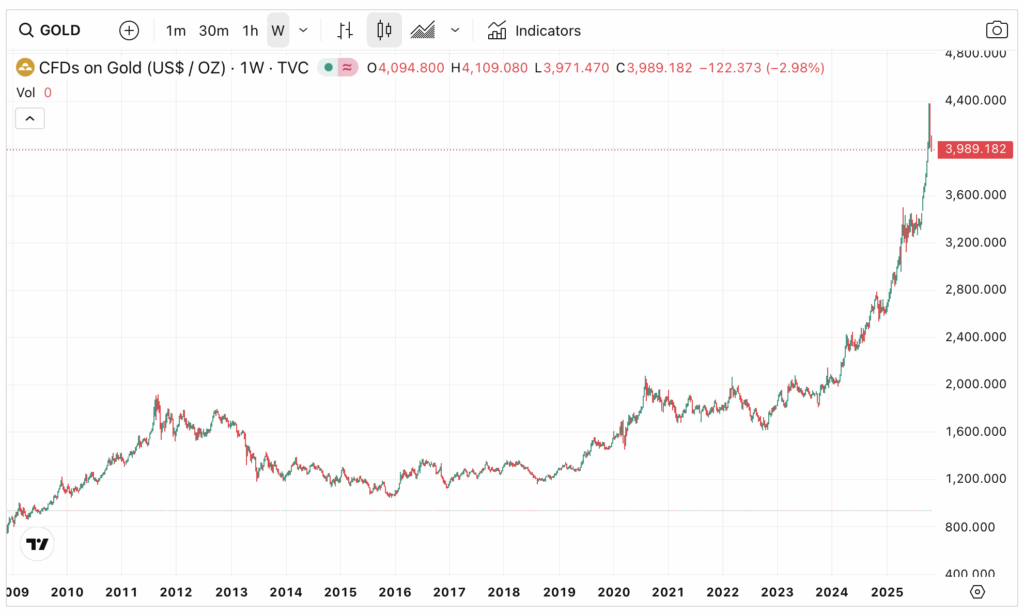 A few weeks ago, I highlighted gold’s immensely powerful upward momentum. Then, the precious metal was hurling itself rapidly towards the $4,000 mark for the first time. Whilst seemingly significant, $4k offered no technical resistance at all to gold’s extraordinary advance. Prices quickly jumped higher and peaked near $4,400 (see below).