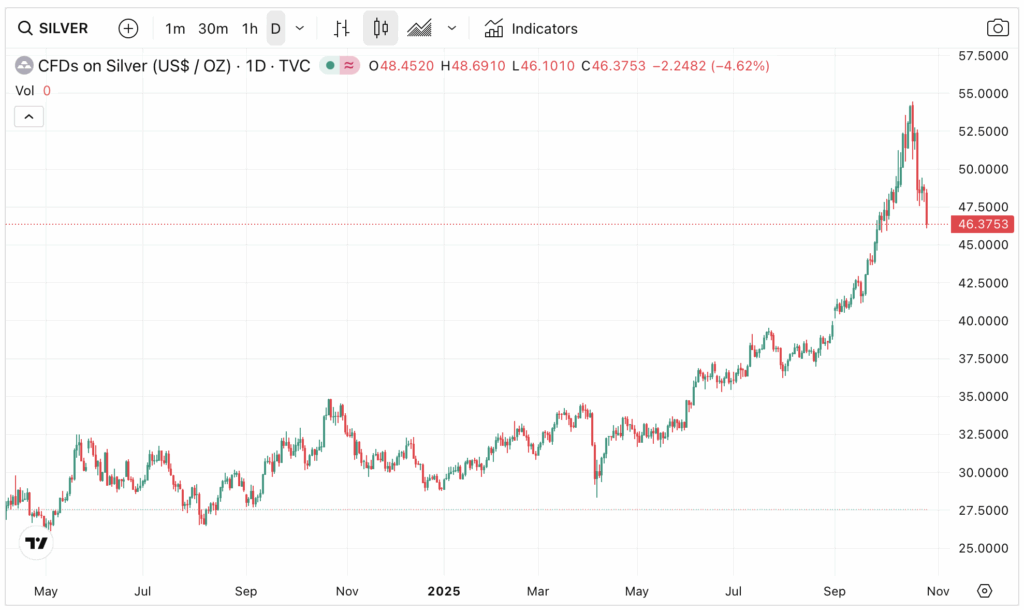 Prices surged nonstop from $40 in early September to above $50. But as soon as gold topped out, silver did so too. It peaked at $54. Prices then broke south of the psychological $50 level and skidded all the way to $46 (see below).