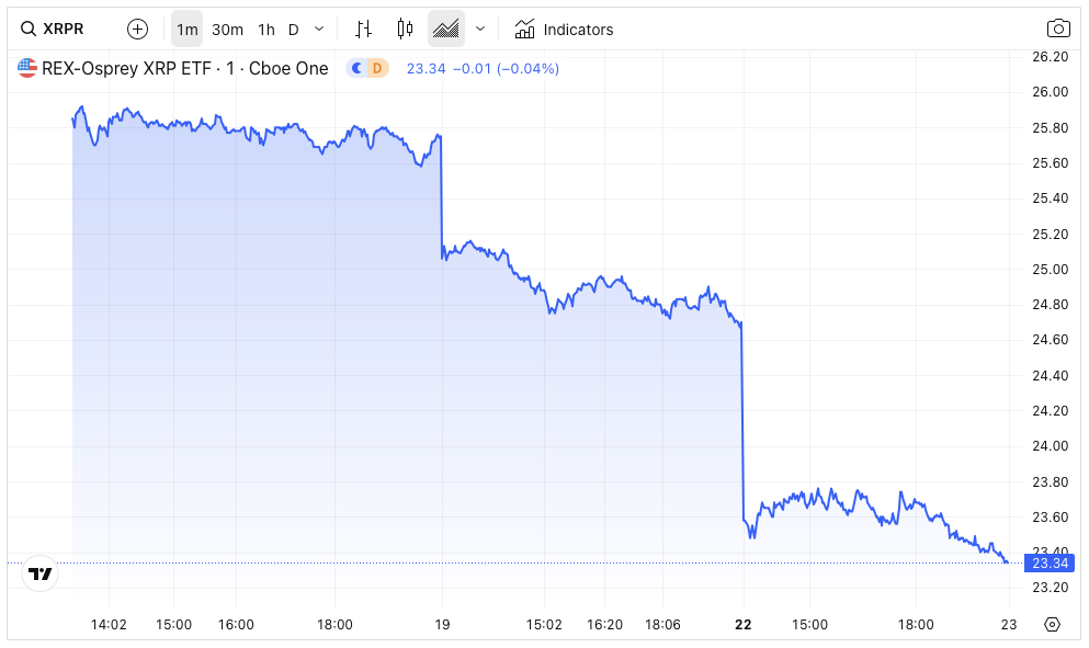 Mind you, XRP ETF (ticker:XRPR) did not fare that much better. The ETF slumped 10 percent since its listing. Its price action mirrors that of DOJE’s – three down sessions in a row.
