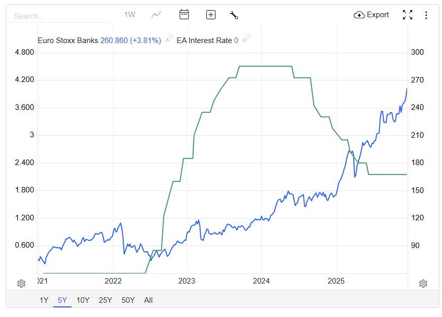 3 weeks agoSometimes the behaviour of the markets deviates from economic theory and that certainly seems to be what’s happening in the first chart below, as EU banks continue rise even as EU interest rates fall .