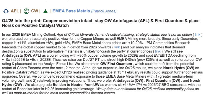 1 day, 21 hours agoCopper is in the headlines once again this morning JP Morgan writes on copper miners maintaining overweight recommendations on several stocks saying: