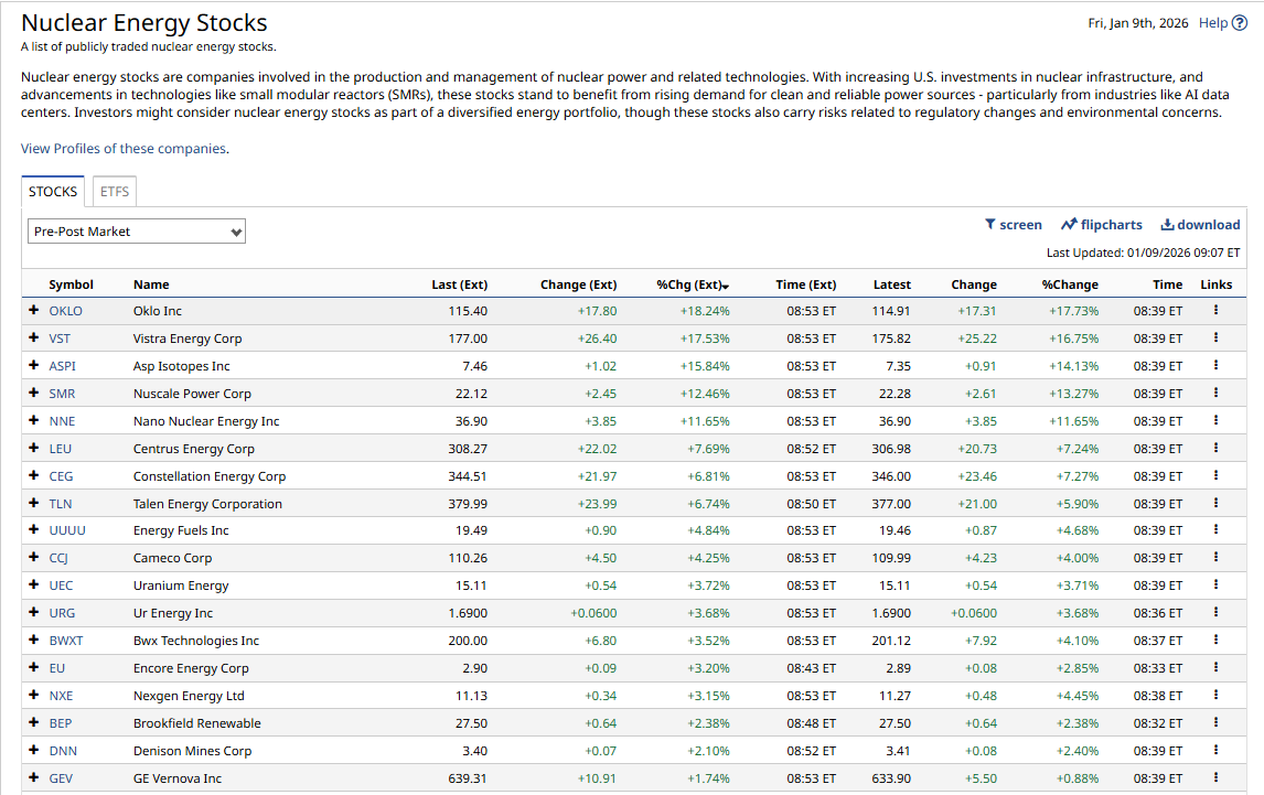 15 hours, 37 minutes agoNuclear stocks are to the fore in the US pre market as Meta Platforms META signs deals with OKLO OKLO and Vistra Energy VST the stocks are either side of +18.0% higher and the news has boosted other names among nuclear energy and uranium stocks.