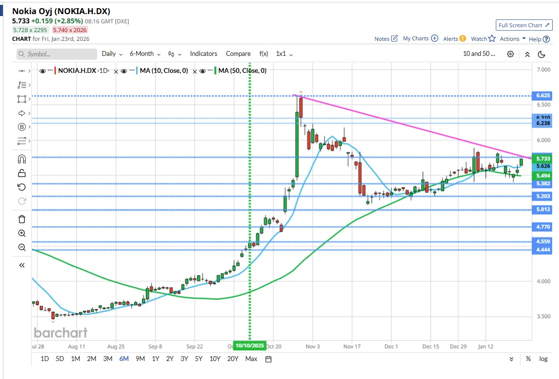 Telecoms networking group Nokia is at an interesting juncture following better than expected results from its Swedish rival Ericsson, which are up +11.28%.