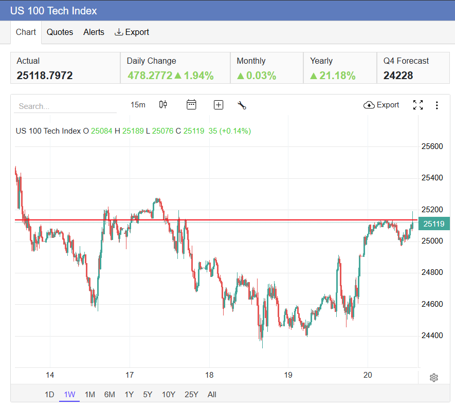 The mood in the market this morning seems to be one of cautious optimism. I will be watching the Nasdaq 100 index for clues and in particular how it performs around old support and resistance circa 24446/50 and 25536/40 above that .