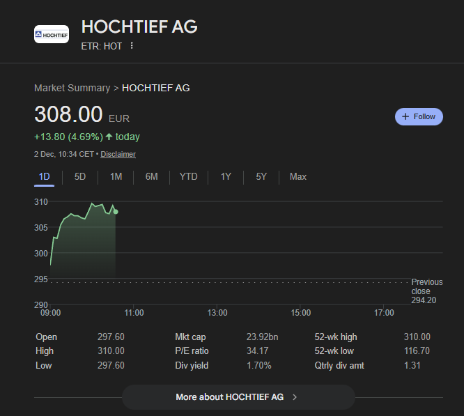 1 month, 1 week agoHochtief AG HOT GR, which I highlighted yesterday, in my comments on German midcaps, are up +4.70% today and have printed as high as €3.10 this morning .