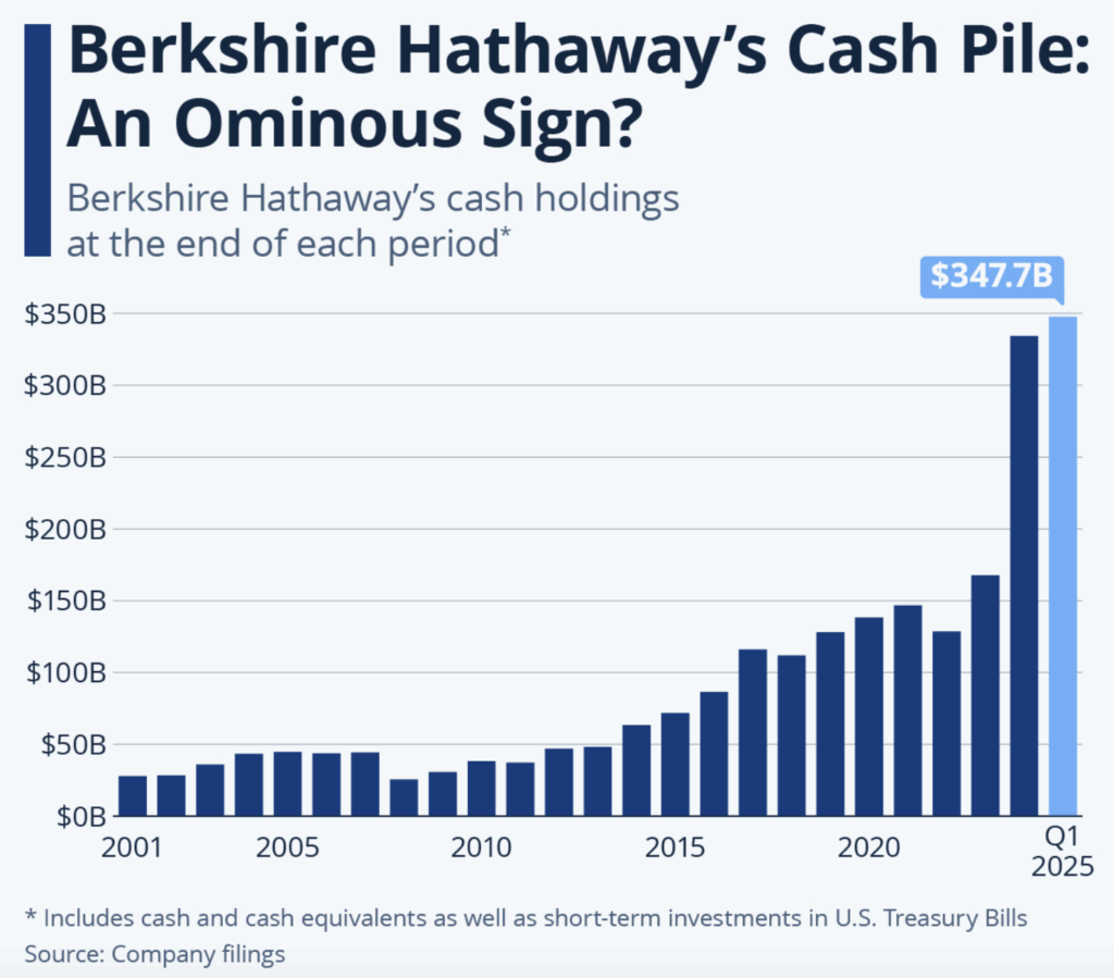 According to its latest quarterly report, Warren Buffett’s holding company is sitting on cash and short-term Treasuries totalling almost $340 billion. In contrast, BRK.A’s equity investment is recorded at $268 billion. The fact that Berkshire’s highly liquid assets now surpass its equity investment by $70 billion is telling, and ought to tell you something about his estimation of “attractive” opportunities emerging in the next few years.