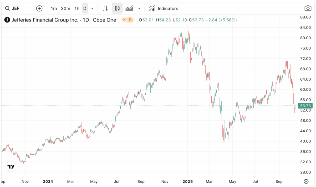 First Brand’s bankruptcy in 3Q was an unexpected credit event. The Chapter 11 ensnares a few financial names, such as Jefferies (JEF). As market speculates on its credit losses, the first thing investors did was to flee the scene. JEF’s share price tanked from $70 to $50 in a matter of days (see below).